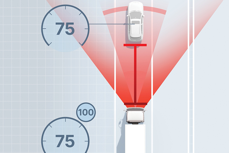 FACC uses a radar and camera to detect the vehicle in front of the truck, then maintains a set distance from that vehicle by slowing or speeding up the truck accordingly. FACC will work at any speed, so if the vehicle ahead comes to a stop, the truck will too.
